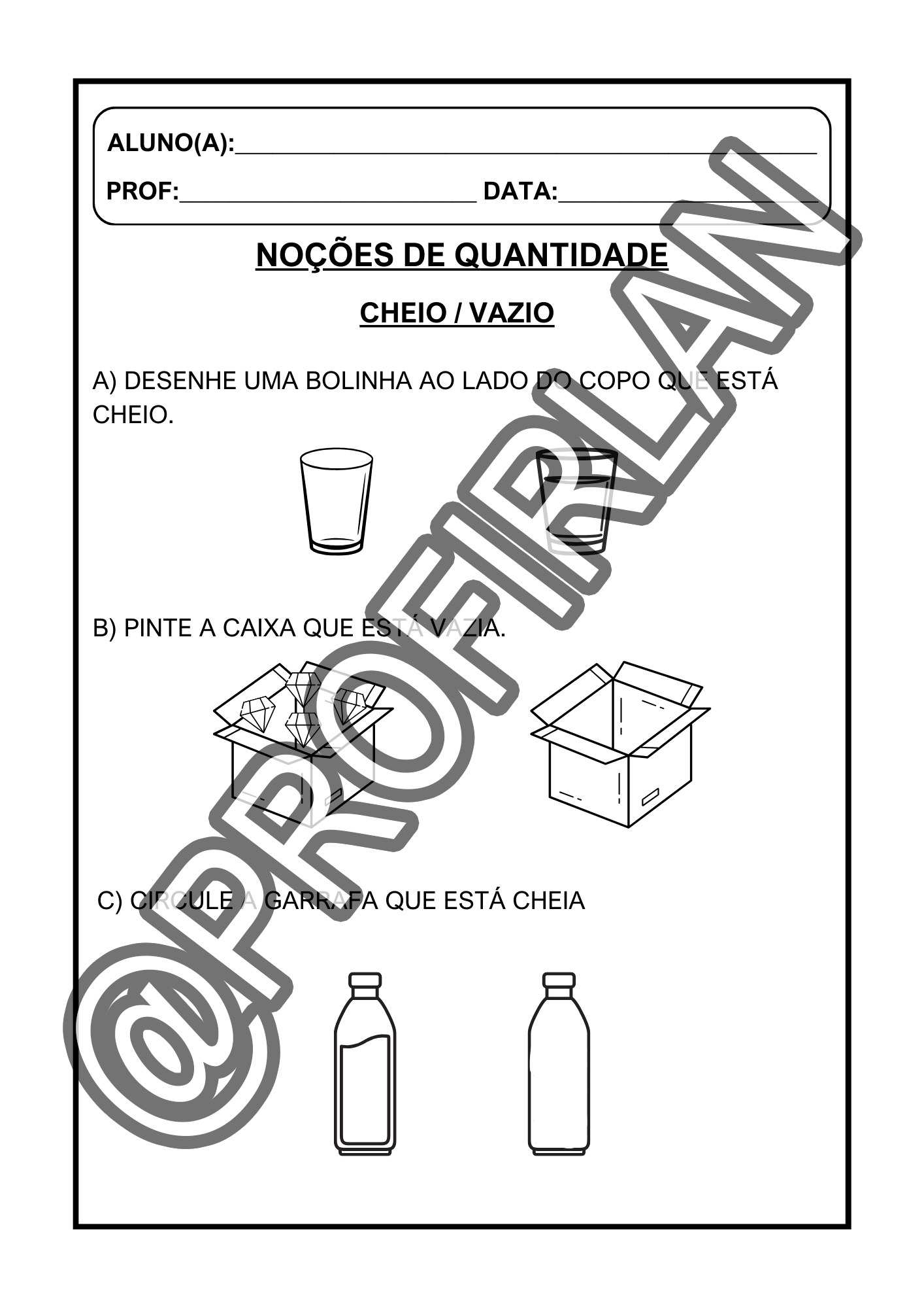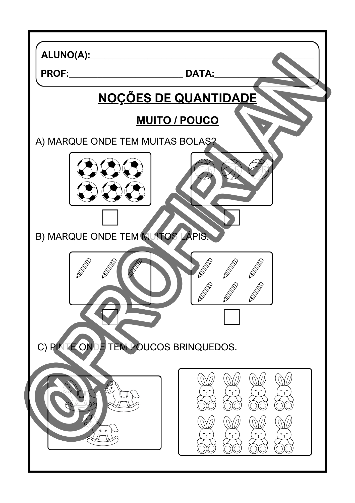 Atividades de noções de quantidade (muito/pouco, mais/menos, cheio/vazio, igual/diferente);