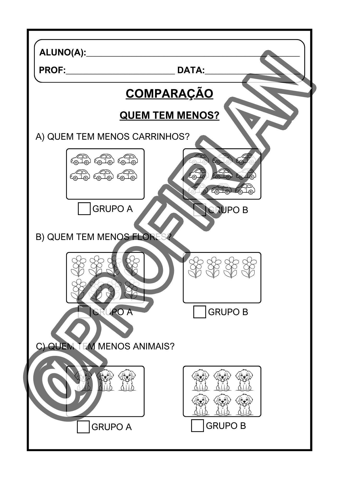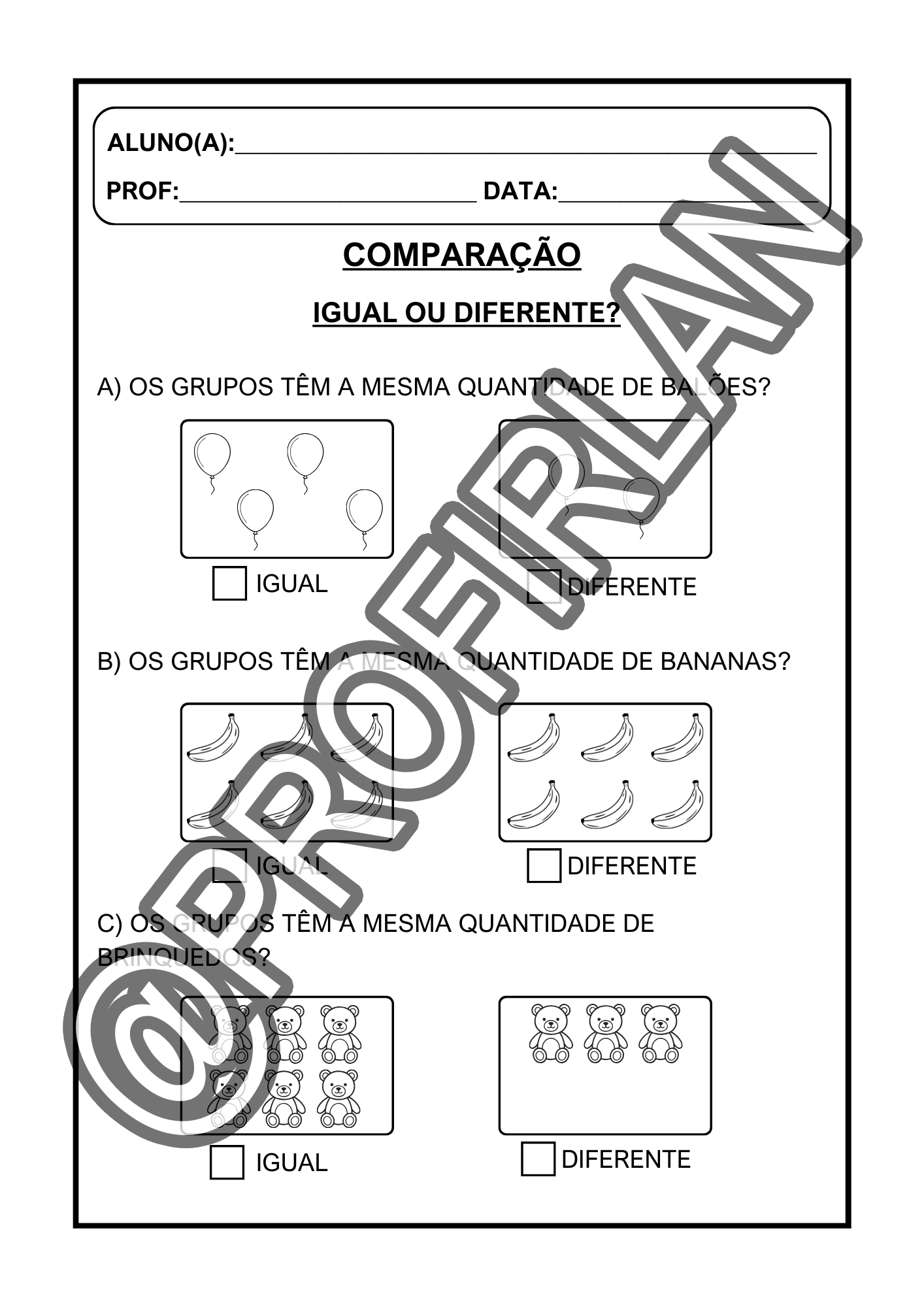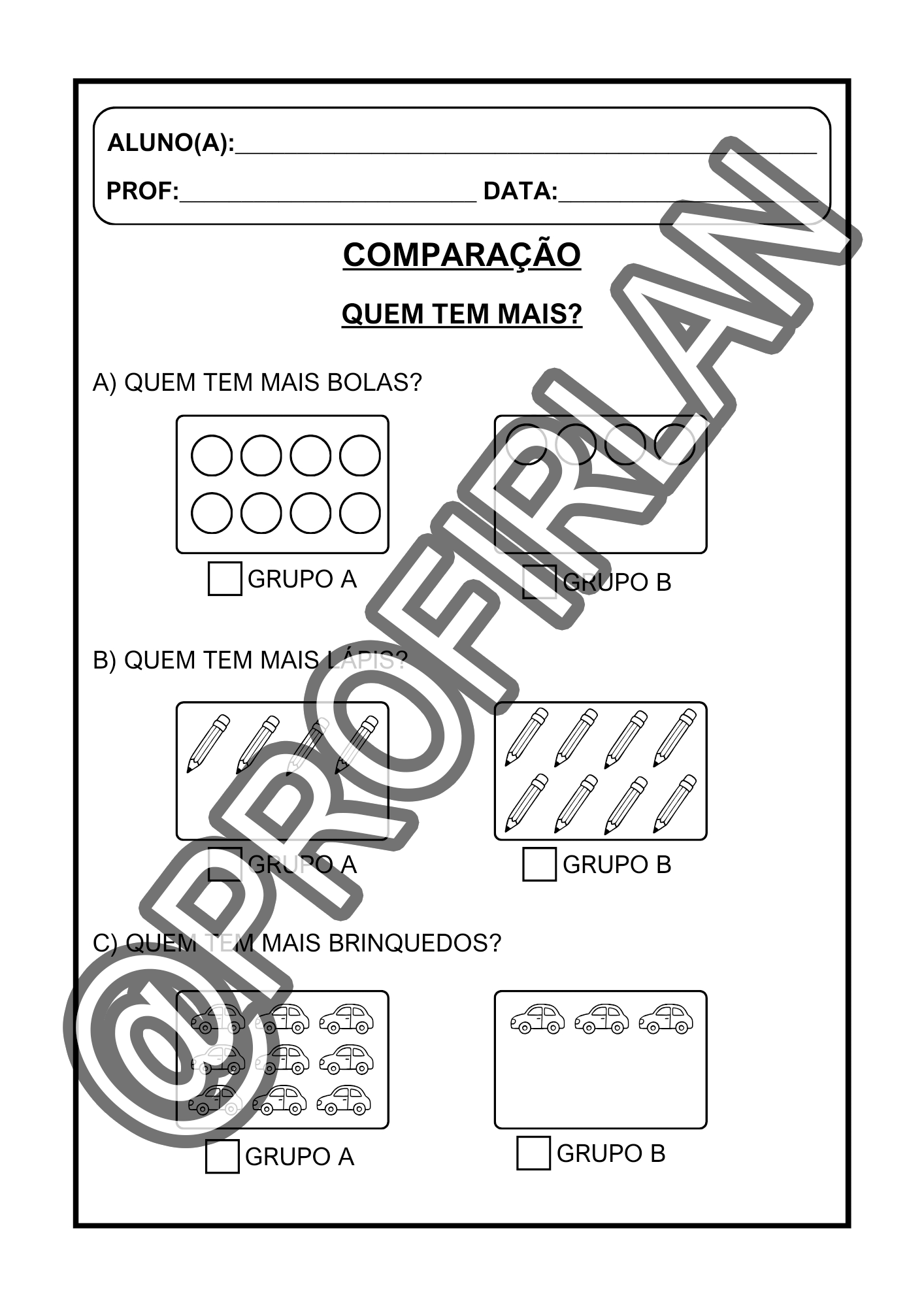 Exercícios de comparação (quem tem mais, quem tem menos, igual ou diferente, maior ou menor);